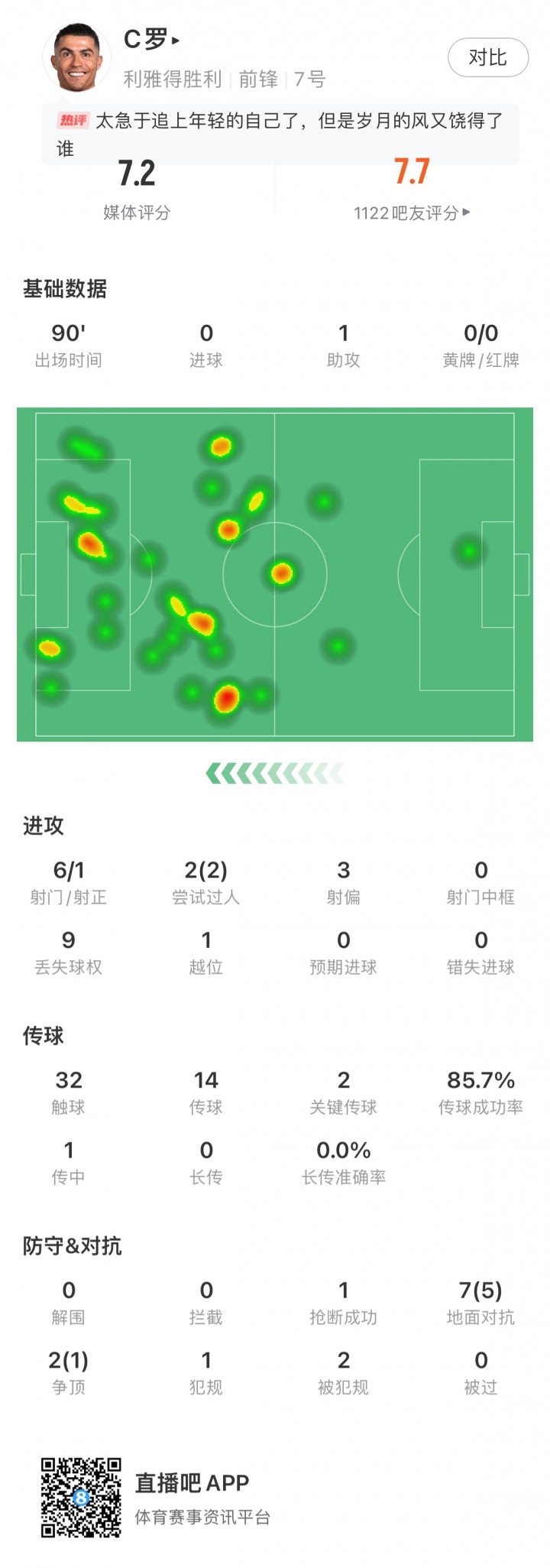 C罗本场贡献一次助攻,六次射门一次射正,完成两次过人及七次对抗五次成功 日期:2025-09-06 21:45:51 作者:xiaoqiao 栏目:西甲 浏览:87 评论:0 8月19日沙特超级杯半决赛,利雅得胜利在少一人作战的情况下以2-1力克吉达联合,成功挺进决赛。C罗首发出场并打满全场,比赛中送出关键助攻。C罗全场数据如下C罗助攻菲利克斯完成破门 延伸阅读: 星空体育app-马卢阿奇:我五年前才开始打球,现在每天都在学习新东西 星空体育app-加布里埃尔门前补射被放倒,裁判经VAR确认后判罚没有点球 【南美杯】弗鲁米嫩塞vs卡利美洲首发阵容名单(2025年08月20日) 周薪近40万镑!记者:维尔茨将在利物浦拿到顶薪,签5年合同 75双雄不老!奥沙利文第2威廉姆斯第6,前10占两席 C罗本场贡献一次助攻,六次射门一次射正,完成两次过人及七次对抗五次成功 标签: 上一篇:星空体育官网-当选南美最佳教练 阿图尔·若热不接葡国总统电话 下一篇:武汉媒体展望三镇客战申花:发挥年轻人冲击力,未必不是合适选择